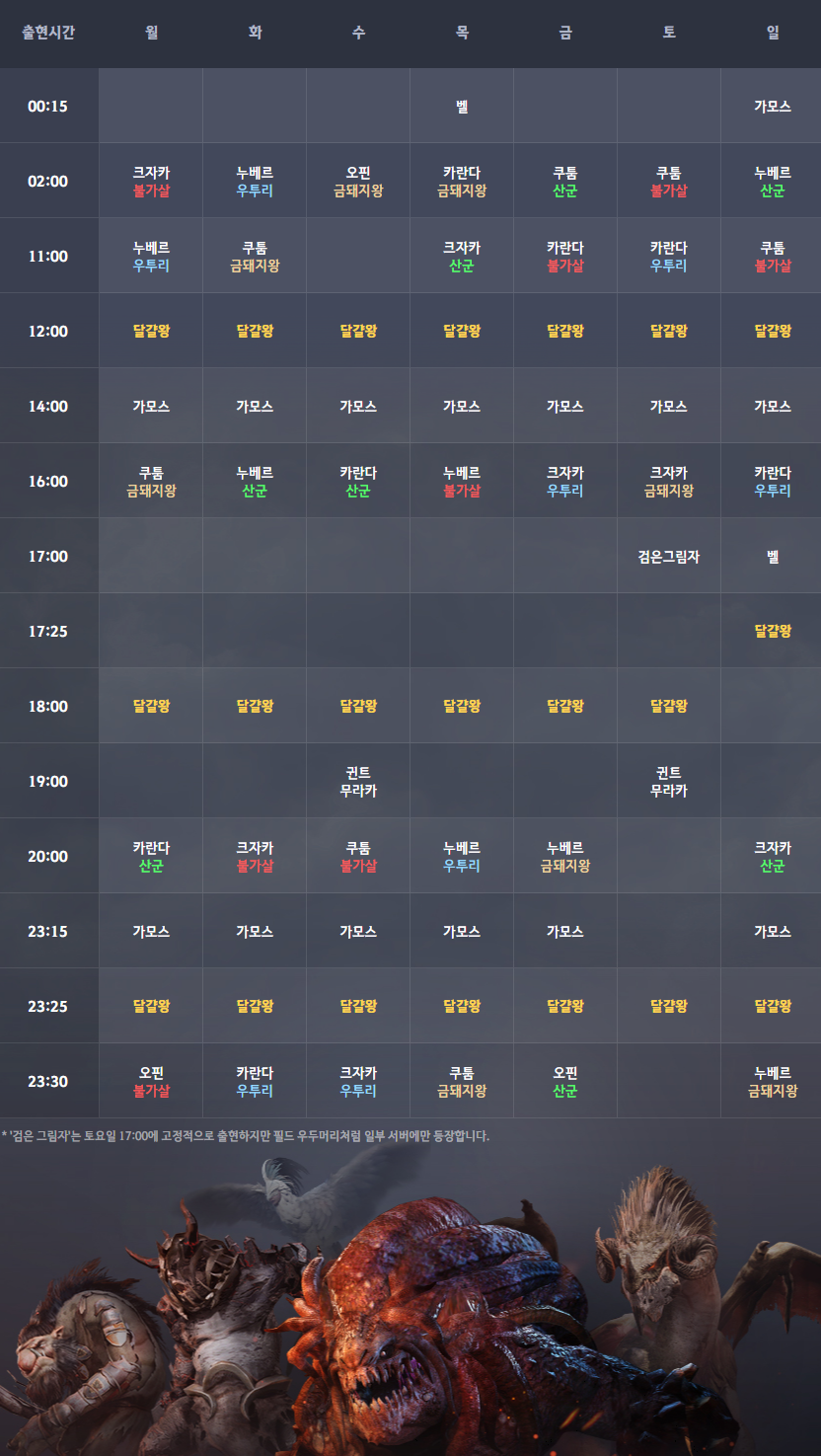 * '검은 그림자'는 토요일 17:00에 고정적으로 출현하지만 필드 우두머리처럼 일부 서버에만 등장합니다.