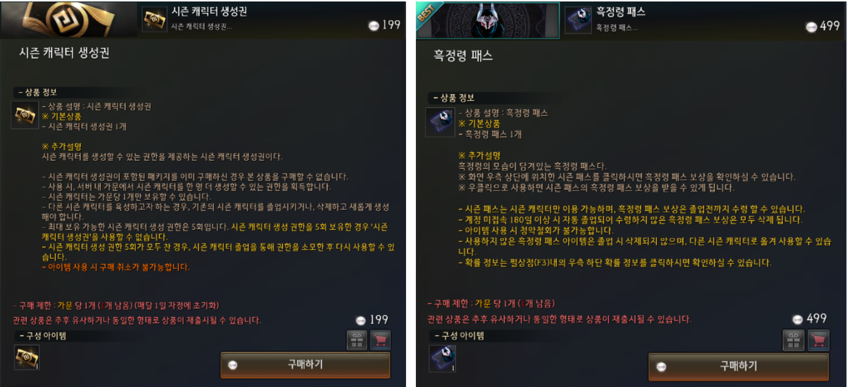 - 시즌 패스와 흑정령 패스에 있는 메이드, 프리미엄 의상,천마의 뿔피리 등을 통해 다양한 펄 상품 수급 가능