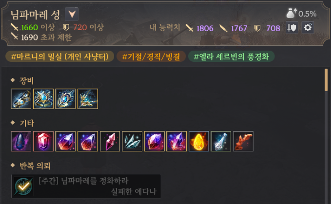 - 추천 최종 공격력과 피해감소: 공격력 1660~1690/ 피해 감소 720 이상