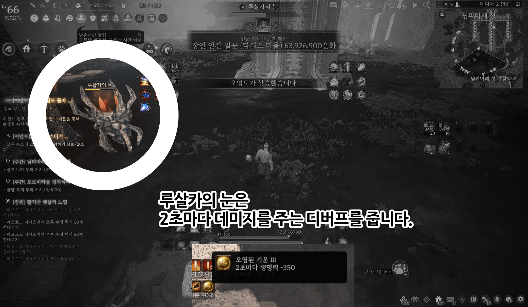 - 루살카 눈이 등장하는 순간 오염도 2단계가 됩니다. 루살카 눈이 장판을 터뜨리기 전에 없앴다면 오염도는 1단계로 떨어집니다.