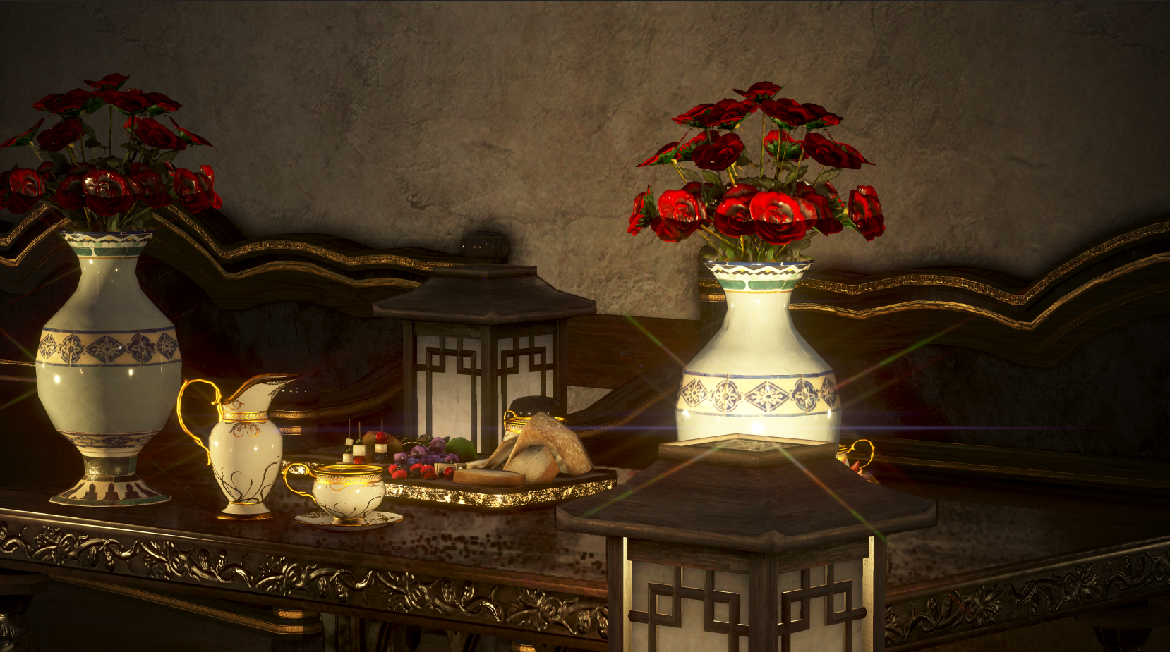 장원 곳곳에 장식된 다과 세트, 꽃병과 인형이