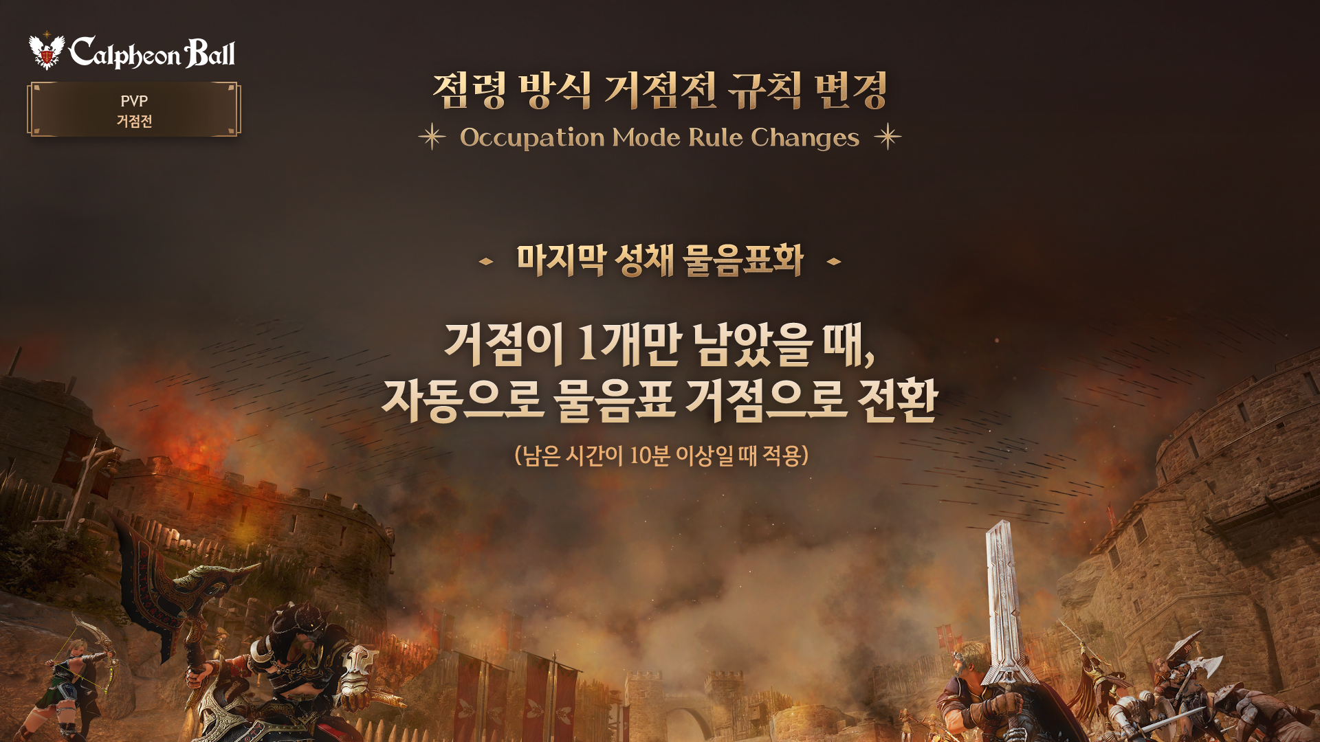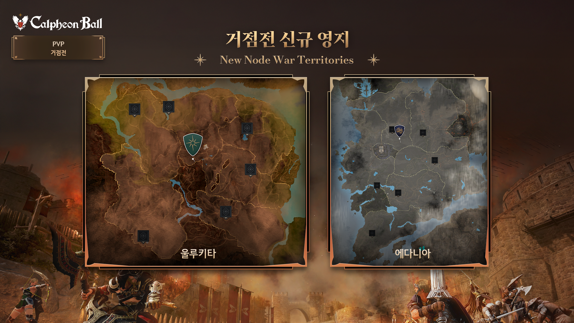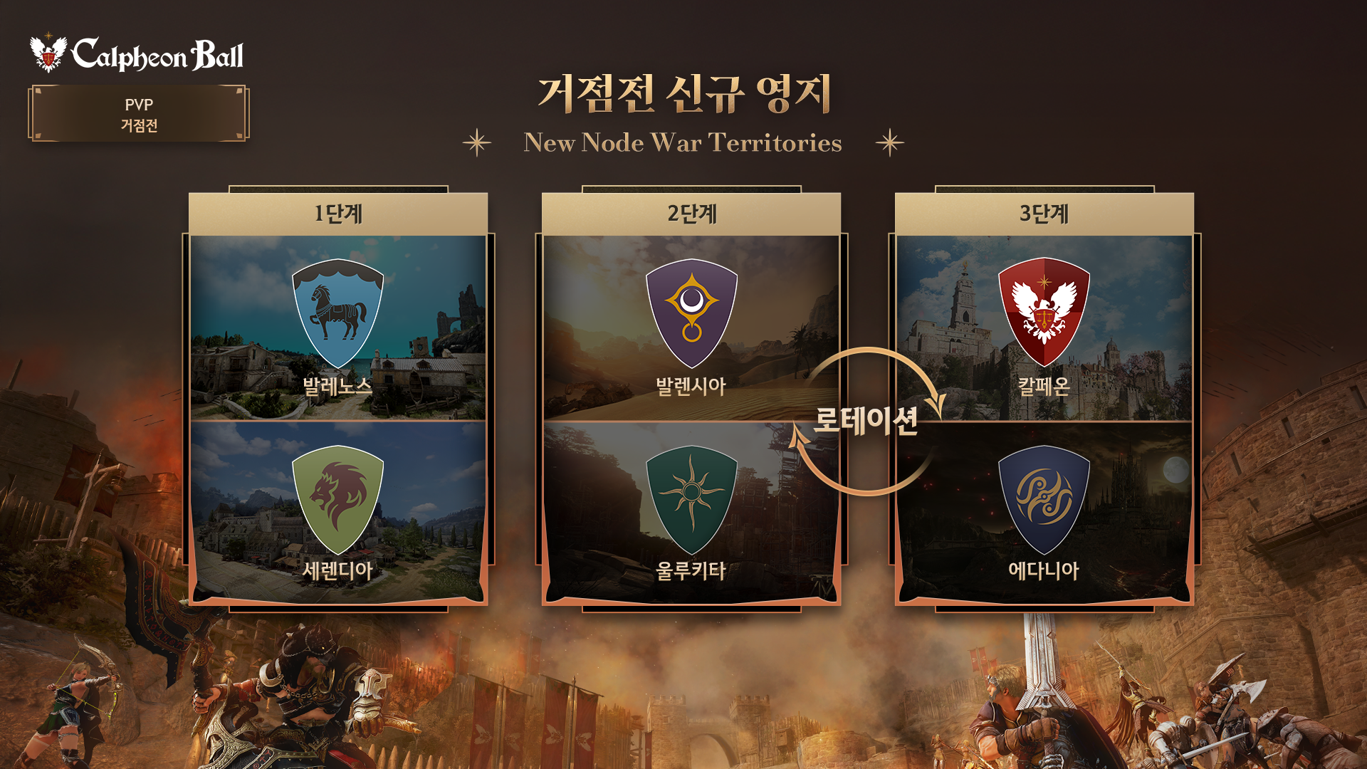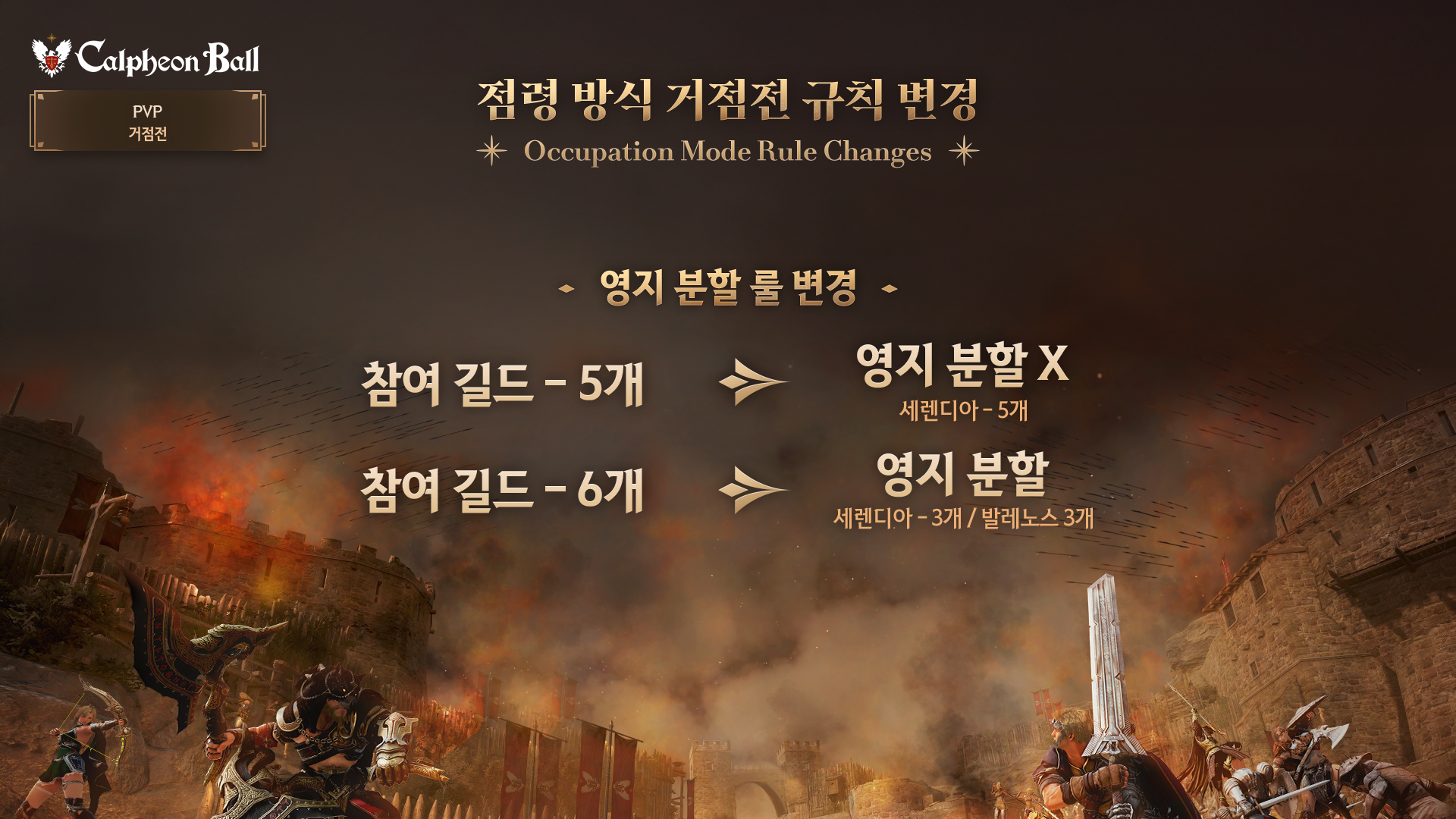 점령전 영지에서 칼페온이 제외되고, 발레노스와 세렌디아가 추가됩니다. 발레노스와 세렌디아 영지는 공성이 아닌 Free-for-All 규칙으로 진행됩니다.