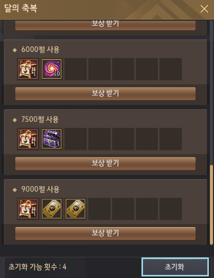 ▲ 달의 축복 보상을 모두 획득한 후 초기화 버튼을 클릭해 보세요.