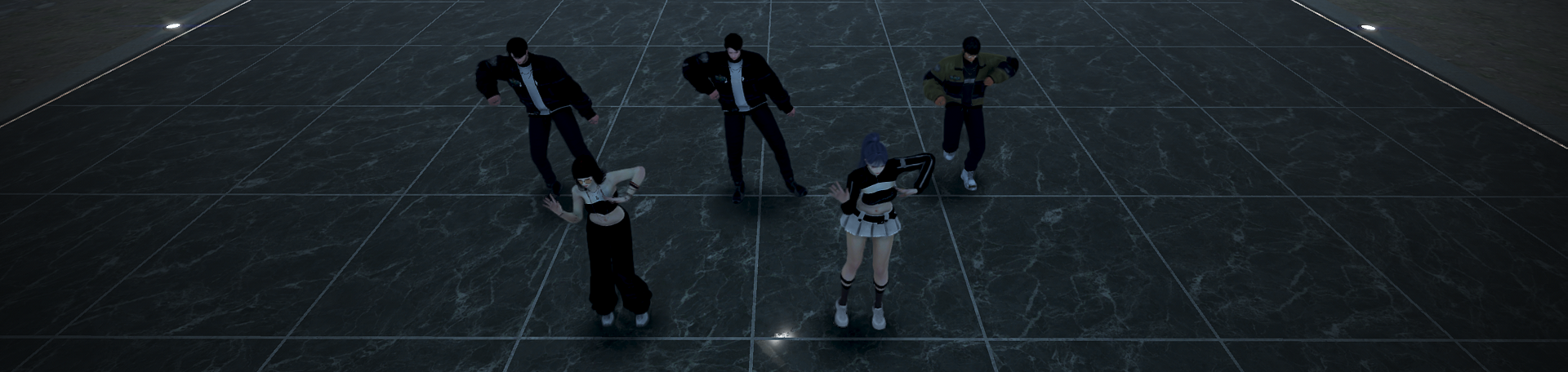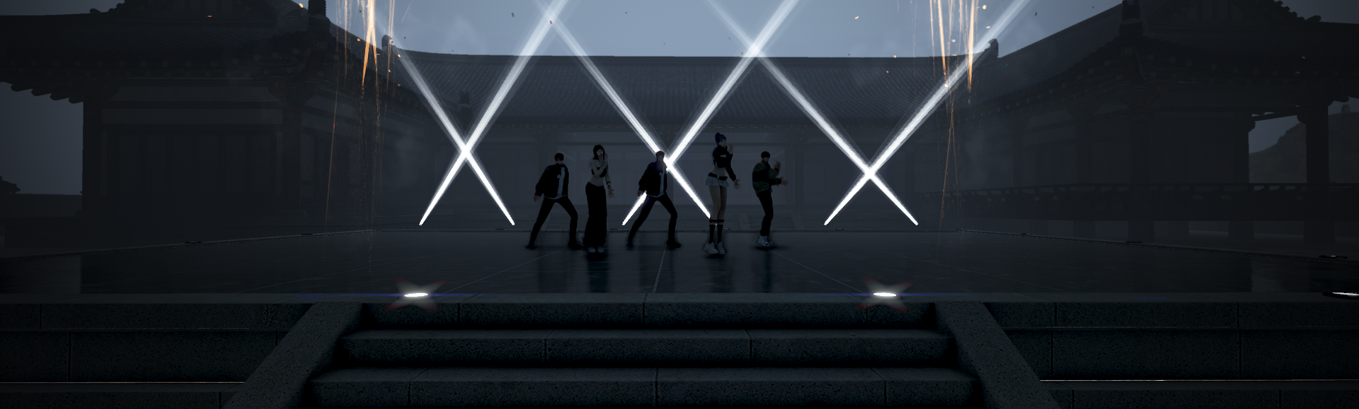 어둑한 배경 사이로 쏟아지는 조명과