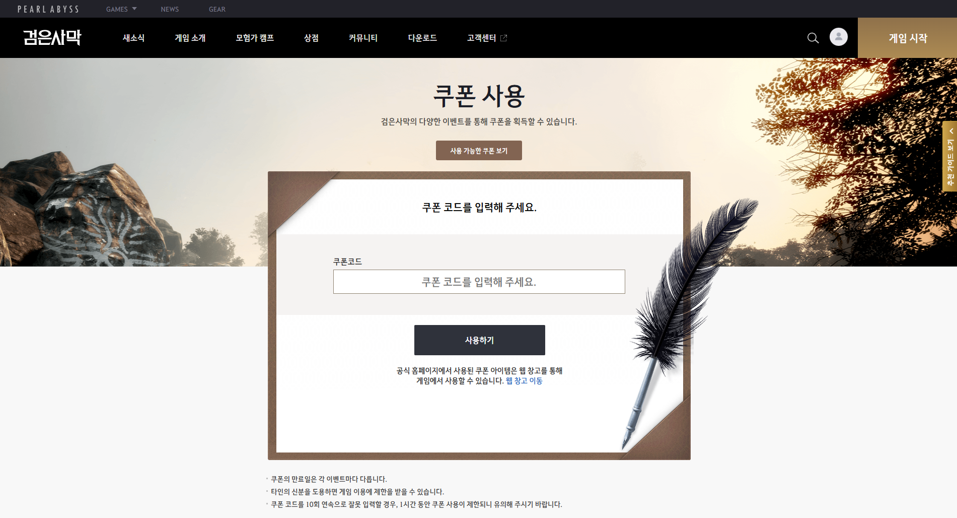 [쿠폰 사용] 버튼을 통해 코드를 입력하면, 게임 내 우편으로 보상이 발송됩니다.