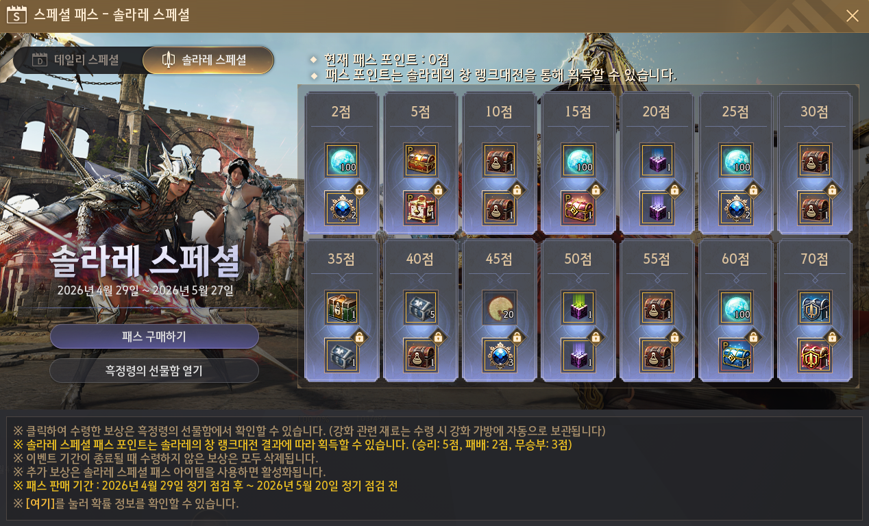 - 솔라레 스페셜 패스 포인트는 2026년 5월 27일(수) 정기점검 전까지 누적하실 수 있습니다.