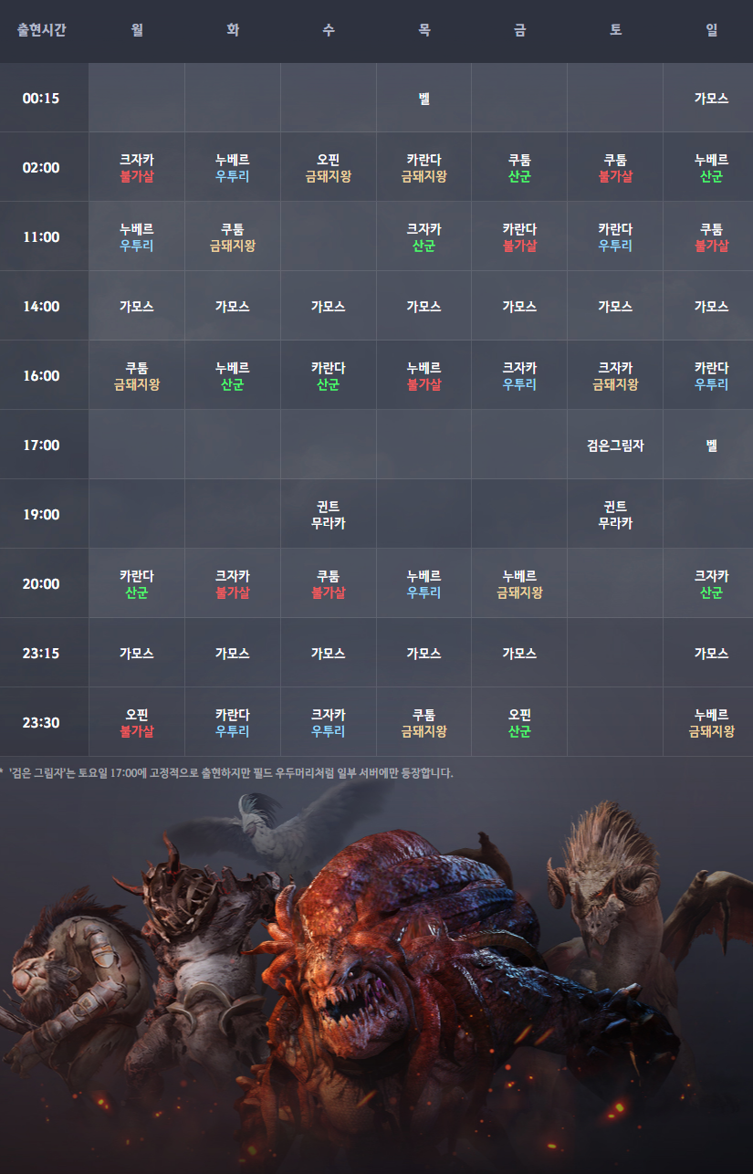 * '검은 그림자'는 토요일 17:00에 고정적으로 출현하지만 필드 우두머리처럼 일부 서버에만 등장합니다.