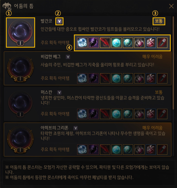 또한, 어둠의 틈 우두머리와의 전투는 사망하더라도 사망 페널티가 없으며 다시 도전하더라도