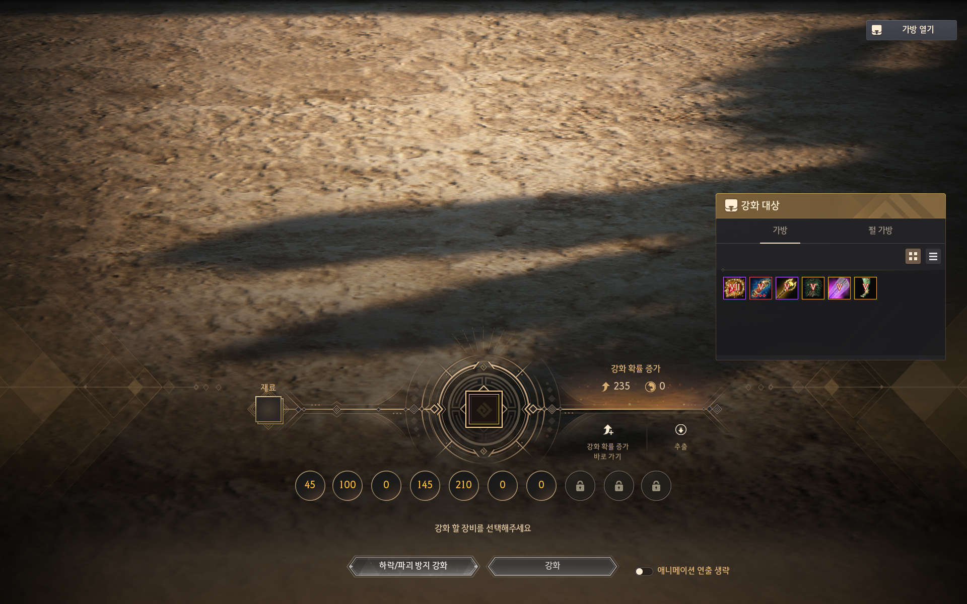- 강화 가능한 장비를 가방에서 선택하여 강화할 수 있습니다.