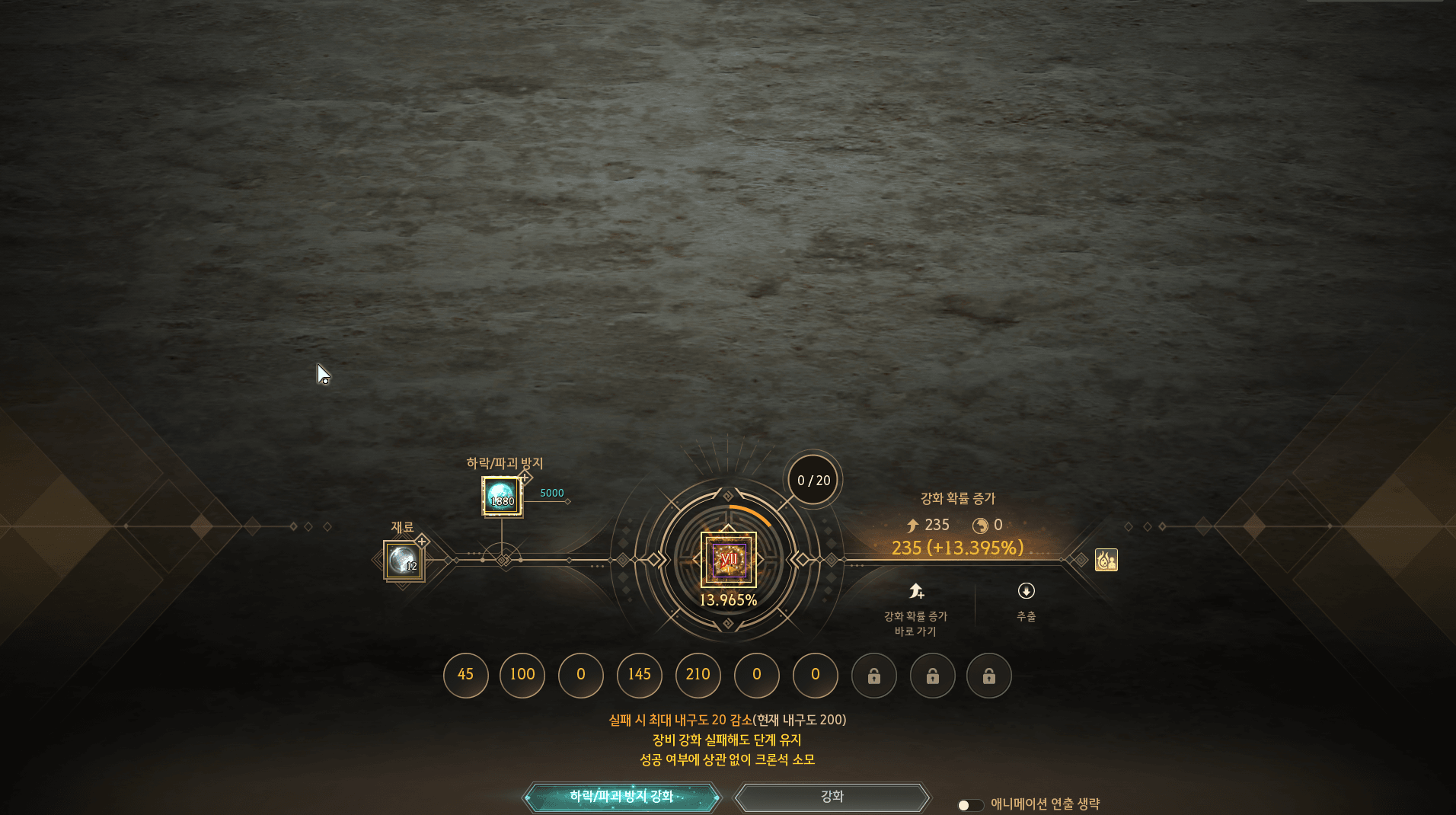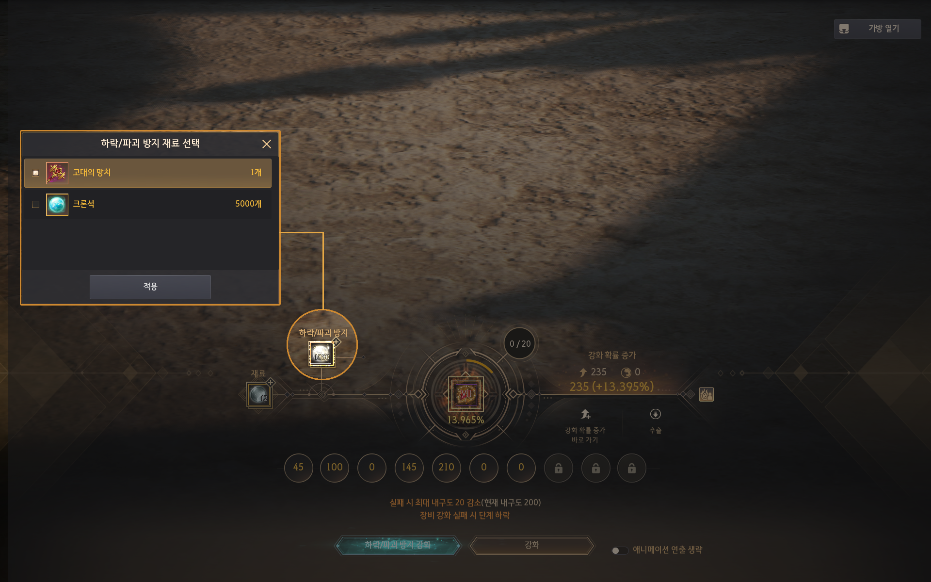 - '하락/파괴 방지' 영역을 클릭하여 강화 하락을 방지할 수 있는 재료 아이템을 선택할 수 있습니다.