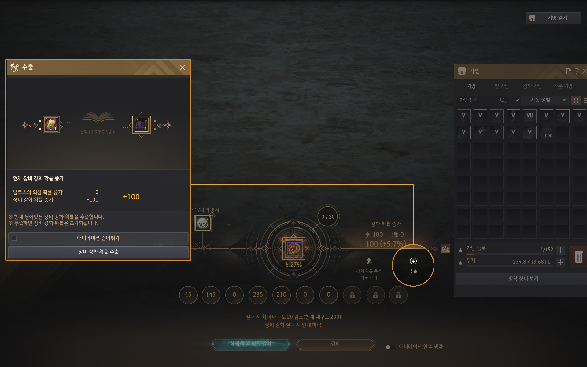 - '추출' 영역을 클릭하여 현재 적용 중인 강화 확률 증가 수치를 다시 아이템 형태로 변환할 수 있습니다.