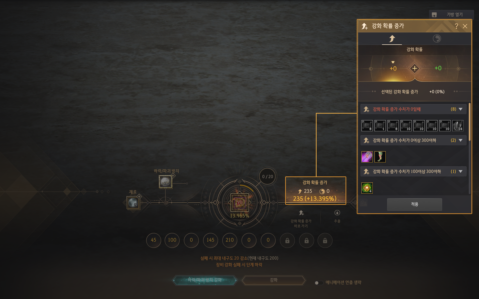 - '강화 확률 증가' 영역을 클릭하여, 강화 확률을 증가시켜 주는 아이템을 선택하고 적용할 수 있습니다.