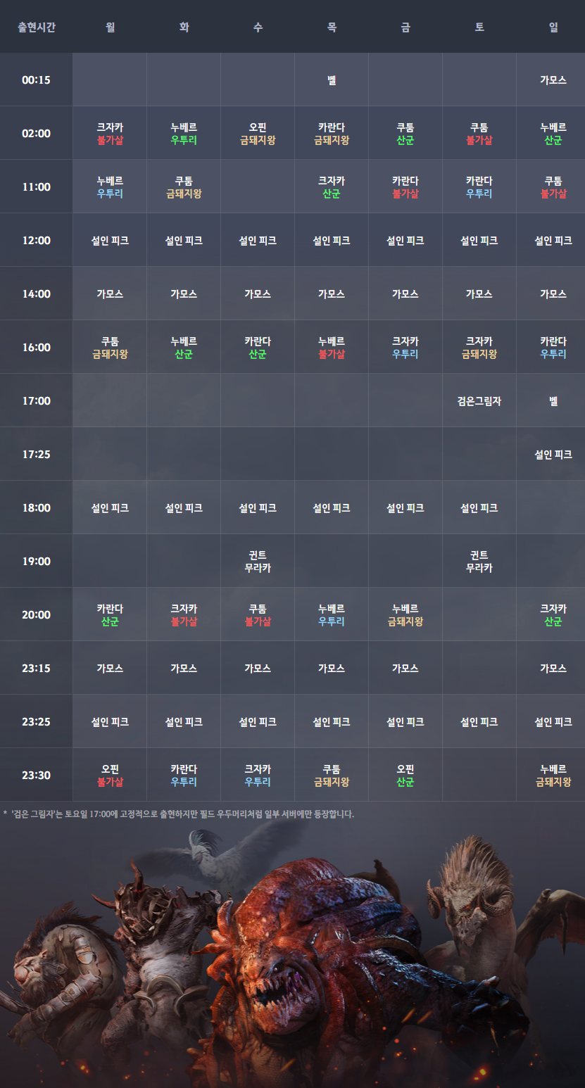 * '검은 그림자'는 토요일 17:00에 고정적으로 출현하지만 필드 우두머리처럼 일부 서버에만 등장합니다.