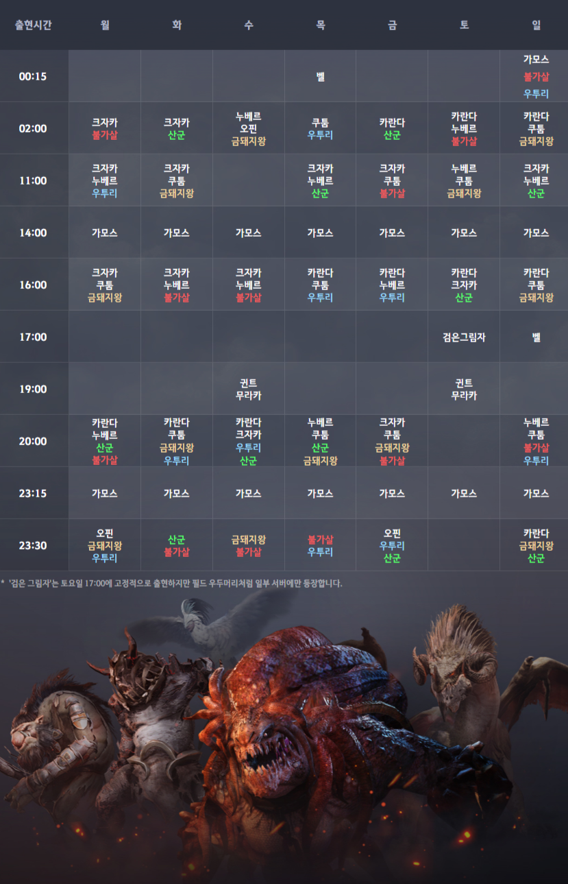 * '검은 그림자'는 토요일 17:00에 고정적으로 출현하지만 필드 우두머리처럼 일부 서버에만 등장합니다.